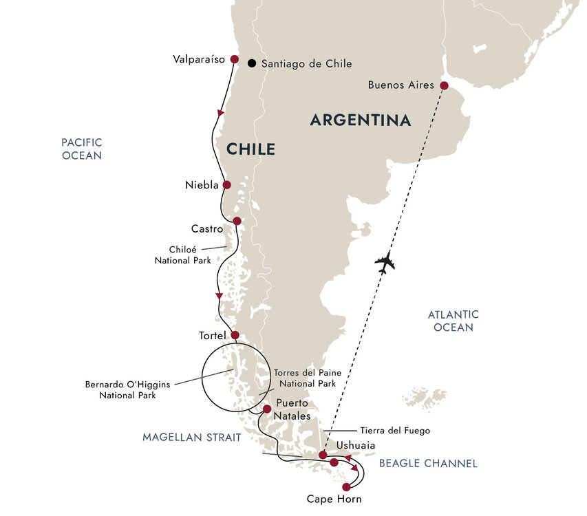 Your expedition cruise to Patagonia and the Chilean fjords comes to an end in Ushuaia, the capital of Argentina's Tierra del Fuego Province. Set against the magnificent backdrop of the Martial Glacier, Ushuaia vies for the title of the world's southernmost city.