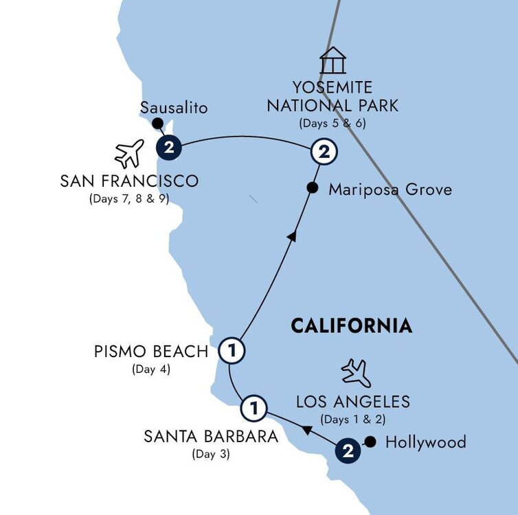 Later drive from Santa Barbara to Pismo Beach. Enjoy stunning ocean views and lush farmlands as you head north into our final destination dotted with olive groves, vineyards, and orchards. Enjoy lunch on your own before you are treated to an olive oil farm tour and tasting experience.