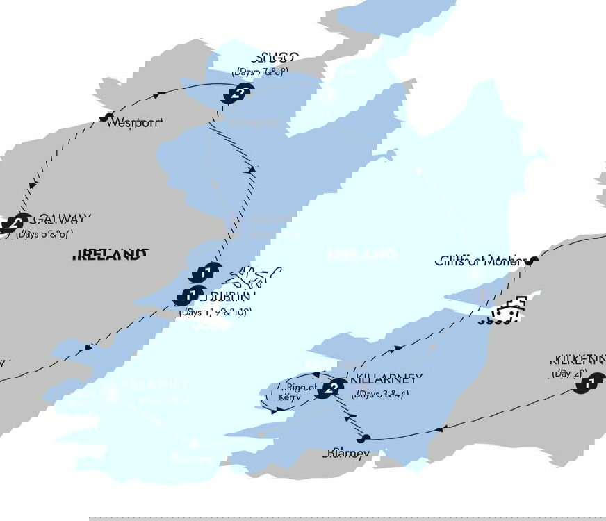 In the afternoon, you can join a Galway Walking Tour to visit notable sights such as the Lynch Memorial, Church of St. Nicholas, Spanish Arch, and Eyre Square, dedicated to the late U.S. President John F. Kennedy. End your day with a delightful dinner at a local restaurant featuring live music. (B/D) Stay: Clayton, Galway