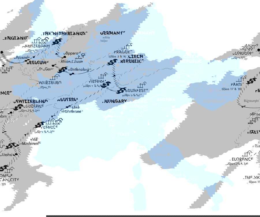 Journey through the rural French countryside of Burgundy, famous for its vineyards and wines, to arrive in the vibrant City of Light. During your time in Paris, see the impressive Eiffel Tower, the magnificent Notre-Dame Cathedral and the imposing facades of the Louvre. Discover the banks of the Seine with its many romantic bridges, see the obelisk in the centre of the Place de la Concorde and drive along the Champs-Élysées to the Arc de Triomphe.