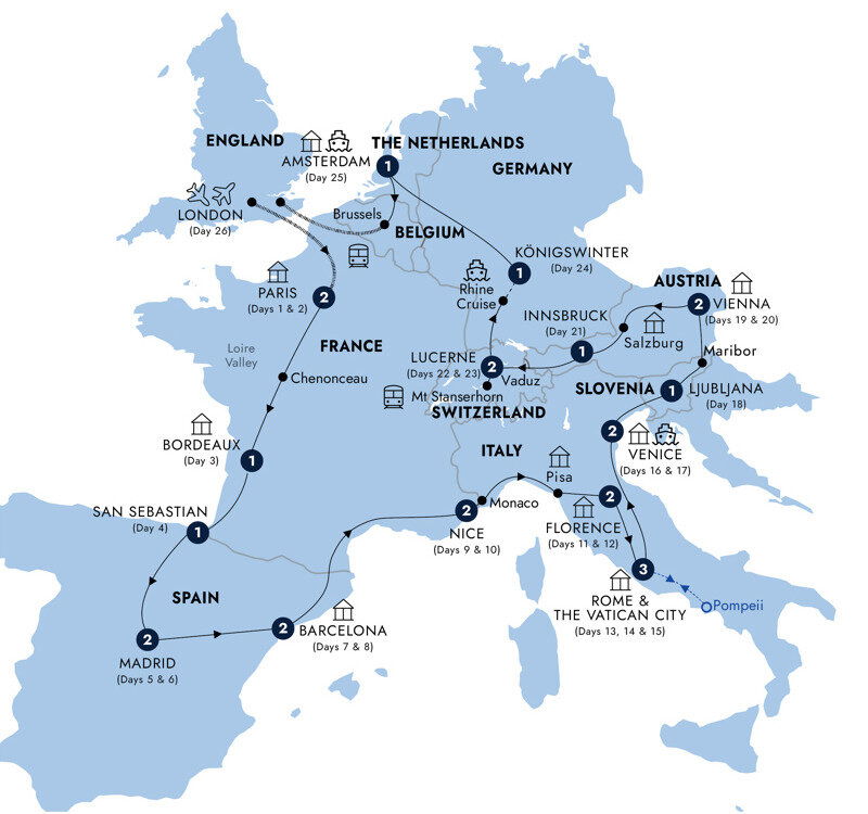 In the morning, travel to Brussels for your high-speed Eurostar train journey. On arrival, you are transferred to the Insight Vacations London hotel where your trip ends. (B)