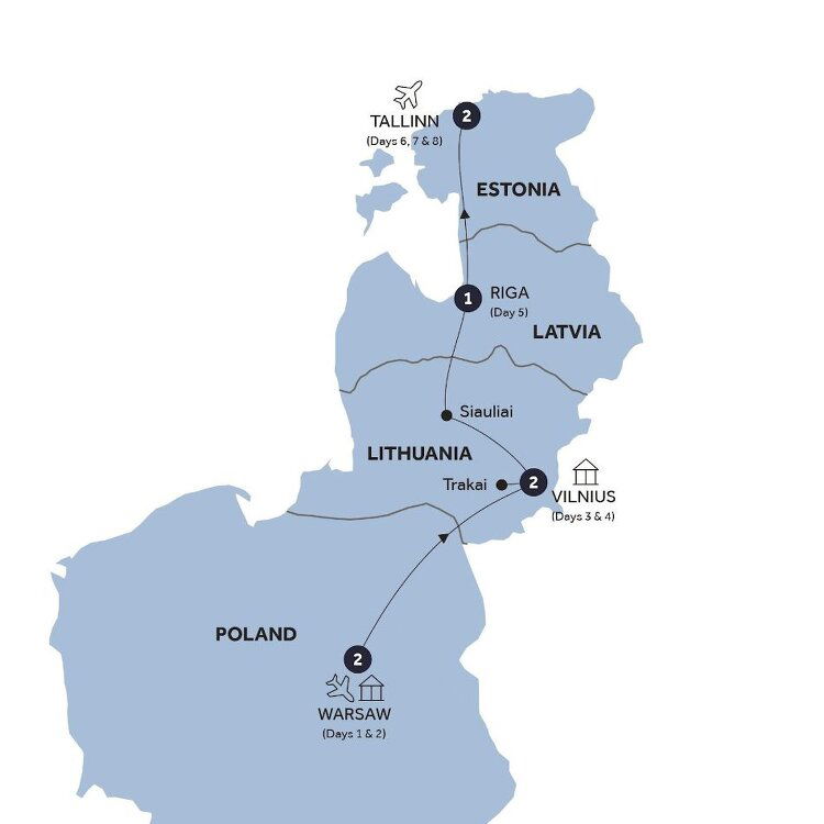 Pass Augustów and Suwalki during your scenic journey through Masuria, a region rich in lakes and vast forests. Cross into Lithuania and continue to the capital city of Vilnius. (B) Stay: Radisson Blu Hotel Lietuva, Vilnius.
