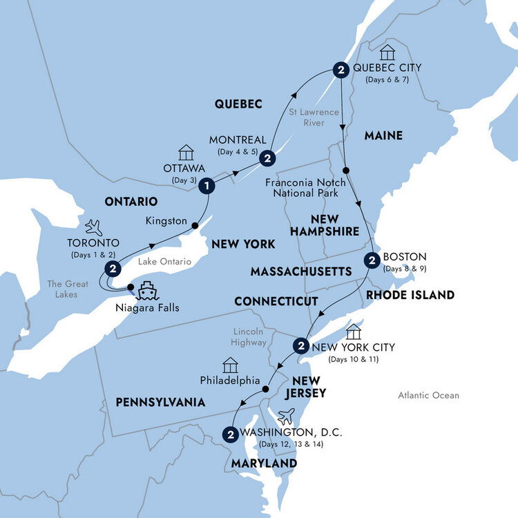 Depart Quebec City, crossing the border from Canada into the USA to explore the scenic beauty of New England. Take in the breathtaking views of the White Mountains as you journey through Franconia Notch State Park, winding past the park's characteristic high peaks and dense woodlands. As Boston's skyline comes into view, feel the excitement grow, as you anticipate two unforgettable nights in one of America's most dynamic cities. (B) Stay: Hyatt Regency, Boston