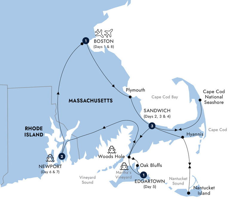 As your tour comes to a close, bid farewell to your fellow travellers and transfer to Logan International Airport for your onward journey. With memories of Boston's historic charm, the beauty of Cape Cod, and the elegance of Newport, you leave with a deeper appreciation for this unique corner of New England. (B)
