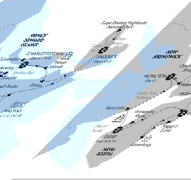 Relax at your downtown hotel next to the waterfront. Perhaps get out and explore this capital city, home to five National Historic Sites including The Halifax Citadel, Georges Island, Fort McNab, York Redoubt and the Prince of Wales Tower. This evening, meet your Travel Director for a dinner. (D) Stay: Marriott Harbourfront Hotel, Halifax