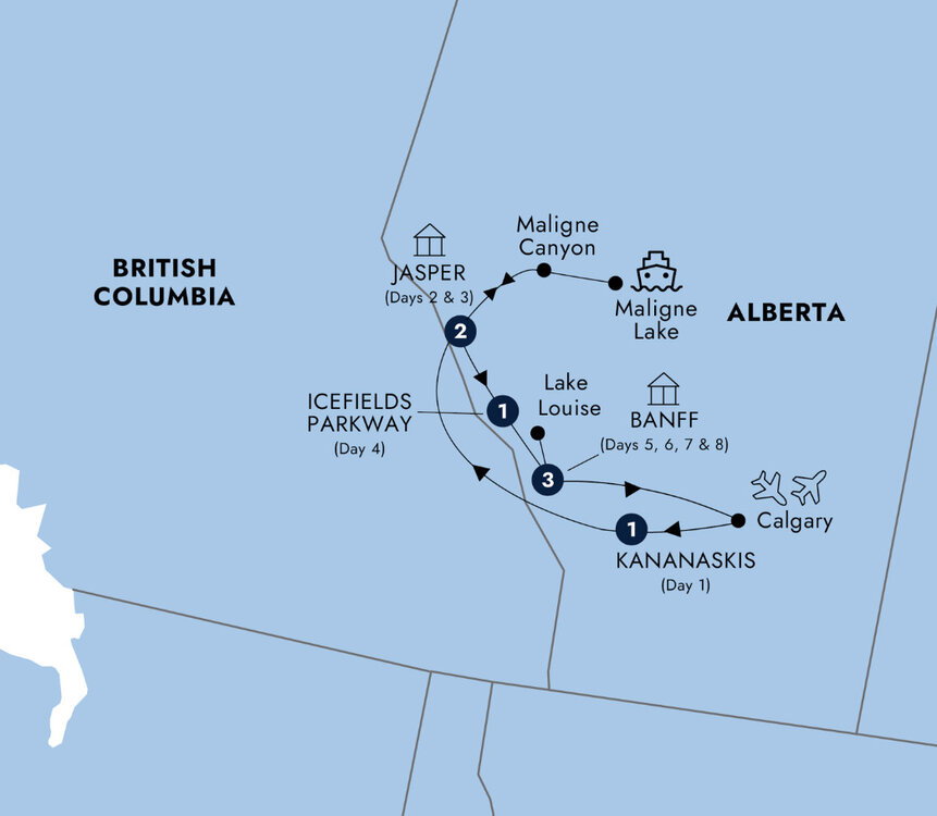 In the evening, gather with your fellow travelers for a delightful dinner, followed by time to relax and enjoy the serene surroundings of Kananaskis Provincial Park. (D) Stay: Pomeroy Kananaskis Mountain Lodge, Autograph Collection