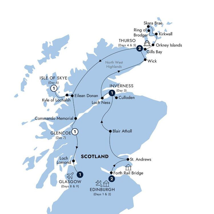 Start the day by boarding the ferry to the beautiful Orkney Islands where the countryside is breathtakingly majestic and the tranquillity supports a quieter pace of life. Here the hardy locals say they live ‘below the wind and above the water'. Your Travel Director accompanies you as you visit the small chapel built by Italian prisoners during World War II, the old Norse town of Kirkwall, 5,000-year-old village of Skara Brae and the mysterious Ring of Brodgar. (B/D)