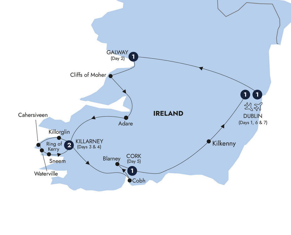 After, take a leisurely excursion around the magnificent Ring of Kerry with stunning views of mountains and sea. Pass through the small towns of Killorglin, where the famous Puck Fair takes place, and Cahersiveen, birthplace of the great patriot, Daniel O'Connell. Follow the narrow road as it winds along the cliffs to the fishing town of Waterville. Continue through delightful villages like Sneem and cross the peat bogs of the Black Mountains to Moll's Gap to admire Queen Victoria's Ladies View.