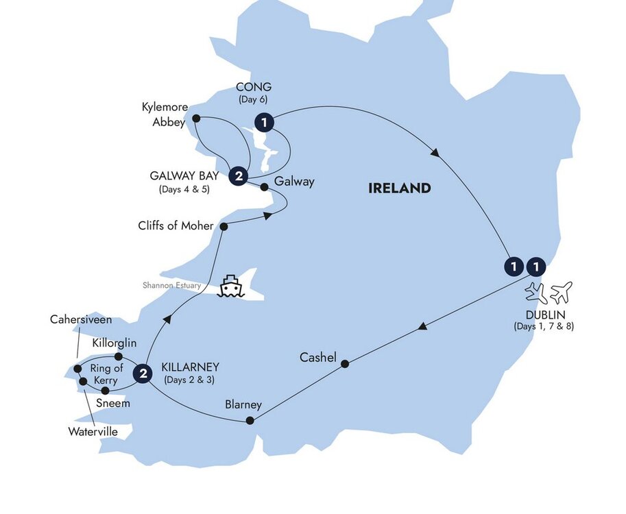 Your journey comes to an end after breakfast. Departure transfers arrive at Dublin airport.