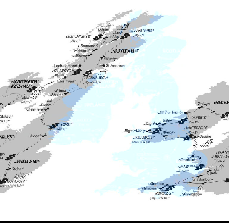 From Rosslare, take the ferry across the Irish Sea to Pembroke and continue on with a pleasant journey through the rural scenery of Pembrokeshire. Travel past the valleys of southern Wales to the capital, Cardiff, famous for its imposing castle and the brilliant Principality Stadium. Enjoy an orientation of the port city, upon the River Taff. (B) Stay: Clayton, Cardiff
