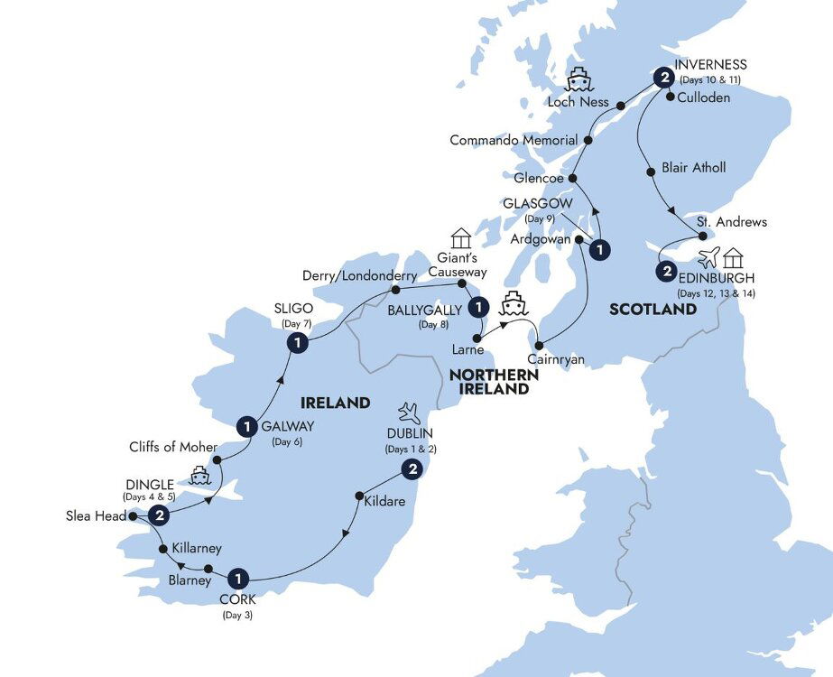 Your 14 days in Ireland and Scotland come to an end after breakfast with transfers arriving at Edinburgh airport. (B)