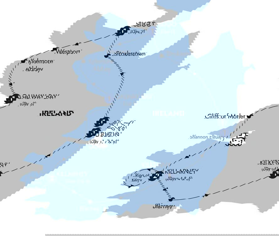 Head to Killarney where you'll relive the highlights of the day over a Dine-Around evening of local cuisine. You also have your pick of Optional Experiences including a Celtic Steps performance or a Gaelic Roots show of song and dance. (B/D) Stay: The Gleneagle, Killarney