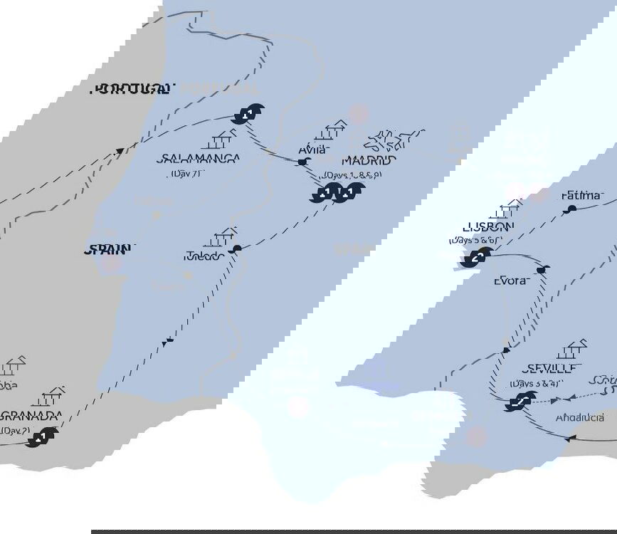 Travel into the green hills north of Lisbon to visit Fátima, the most celebrated place of pilgrimage in Portugal. Visit the chapel commemorating the appearance of the Virgin Mary to three children in 1917. Cross the border, returning to Spain and continue to Salamanca, famous for its golden stone buildings and the handsome arcades of the Plaza Mayor. Across the River Tormes, see the Puente Romano with 15 of its 26 arches dating from the time of the ancient Romans. (B) Stay: Alameda Palace, Salamanca