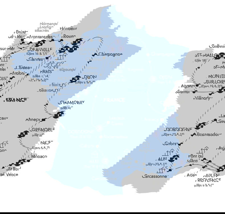 During your time in Paris, see the impressive Eiffel Tower, the Luxor obelisk in the centre of the Place de la Concorde and enjoy a drive along the Champs Élysées to Napoleon's Arc de Triomphe. You are in for a memorable evening with a delicious Celebration Dinner of excellent French cuisine and wine to toast your journey through France. (B/D)
