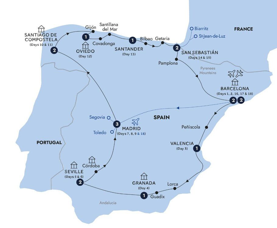 Visit the Holy Cave of Covadonga, a shrine to Pelayo, who achieved the first Christian victory over the Moors in 722. See the unique Roman bridge in Cangas de Onís as you head into the foothills of the Picos de Europa, a national park boasting spectacular mountain and gorge scenery. Enjoy views of the Costa de Cantabria while travelling to Santillana del Mar, arguably the most beautiful village in Spain. Stroll through the rustic cobblestone streets, admiring stone houses decorated with carved, heraldic symbols and reach the delightful church square.