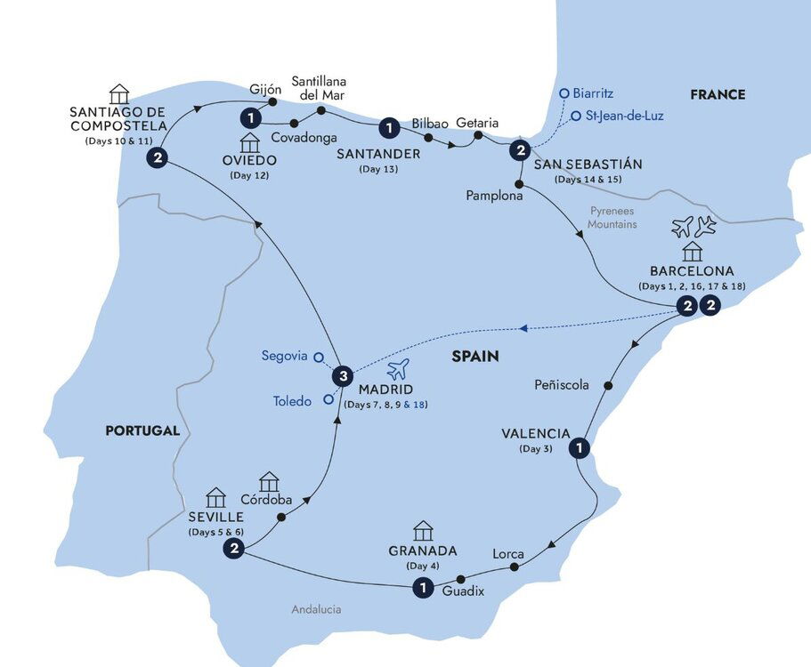 Visit the Holy Cave of Covadonga, a shrine to Pelayo, who achieved the first Christian victory over the Moors in 722. See the unique Roman bridge in Cangas de Onís as you head into the foothills of the Picos de Europa, a national park boasting spectacular mountain and gorge scenery. Enjoy views of the Costa de Cantabria while travelling to Santillana del Mar, arguably the most beautiful village in Spain. Stroll through the rustic cobblestone streets, admiring stone houses decorated with carved, heraldic symbols and reach the delightful church square.