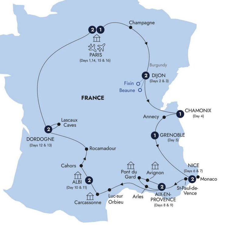 Enjoy the Burgundy capital of Dijon. Its many handsome buildings recall the time when the Dukes of Burgundy were more powerful than the Kings of France. Perhaps take the opportunity to visit the wine capital of Burgundy, Beaune? In the evening, don't miss the chance of an optional Burgundy wine tasting and traditional dinner in the Premier Cru village of Fixin. (B)