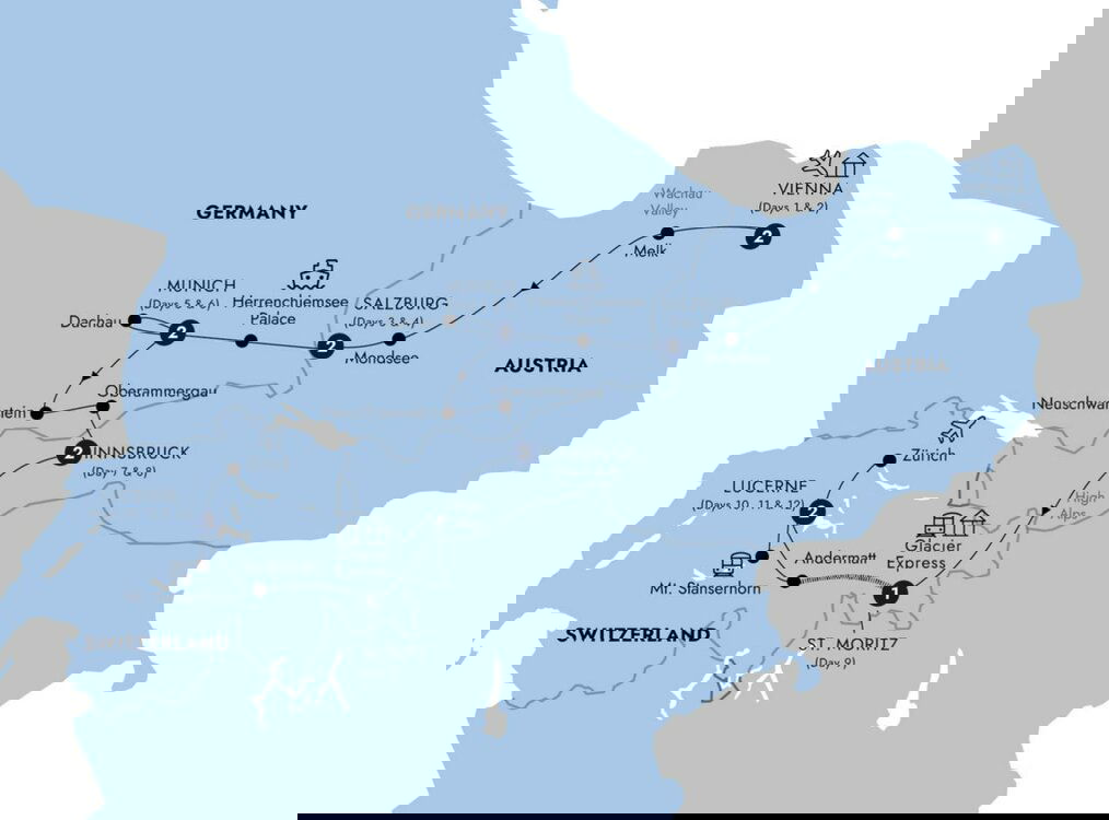 Take in the stunning views of the beautiful Engadine Valley, as you enter Switzerland headed for the chic Alpine resort of St. Moritz. Enjoy the town's marvellous scenery, fresh air and maybe visit its many museums or shop for souvenirs. Perhaps experience one of Europe's outstanding train journeys over the Bernina Pass. (B/D) Stay: Crystal, St. Moritz, Steffani, St. Moritz