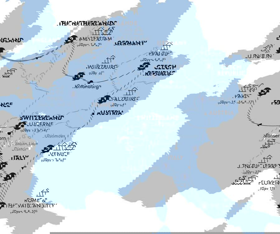 Venture to Rothenburg ob der Tauber, the most well-preserved town on the Romantic Road. Continue east to the Czech border, passing the town of Pilsen renowned for its beer, to reach the Golden City of Prague.