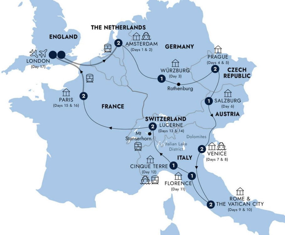 Pass Milan as you head north for the Italian Lake District via Lake Lugano. Continue into the heart of the Swiss Alps, passing through the Saint Gotthard Tunnel, one of the longest road tunnels in the world. Travel alongside towering mountains and past rushing torrents, down to scenic Lake Lucerne, where you are leisure for the rest of the afternoon. (B) Stay: Astoria Lucerne
