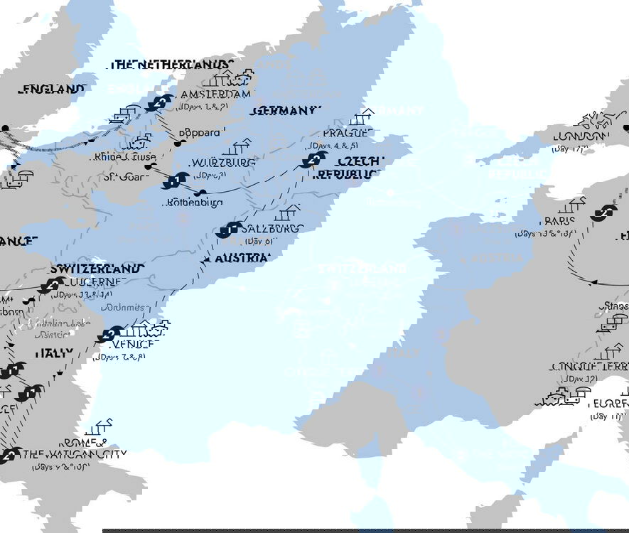 Cross into Germany and travel through the Rhine Valley to Boppard, where you'll board a cruise along one of Europe's most storied stretches of river. Sail towards Sankt Goar, past hillside castles, vineyard-covered slopes and the steep Lorelei Rock, long tied to legends of river sirens and sailors. A wine tasting on board will bring the flavours of the valley into the moment Later, there's time to stroll the cobbled lanes of Würzburg's Old Town and admire the stone saints that line the 16th-century Alte Mainbrücke. (B/D) Stay: Maritim, Würzburg