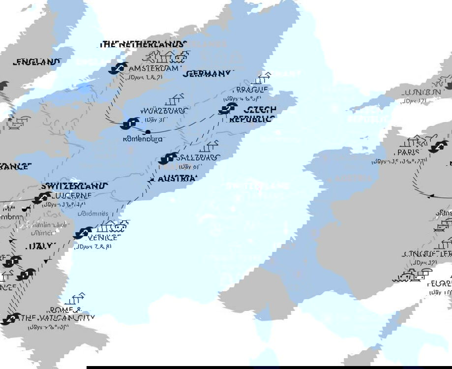 Pass Milan as you head north for the Italian Lake District via Lake Lugano. Continue into the heart of the Swiss Alps, passing through the Saint Gotthard Tunnel, one of the longest road tunnels in the world. Travel alongside towering mountains and past rushing torrents, down to scenic Lake Lucerne, where you are leisure for the rest of the afternoon. (B) Stay: Astoria Lucerne