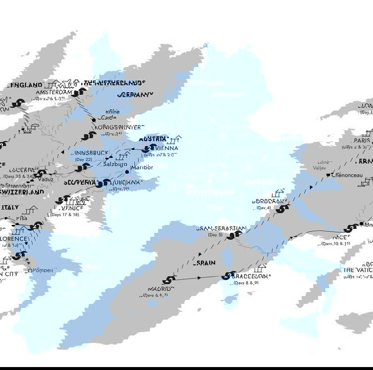 Journey past flower-filled meadows and picturesque chalet-style villages to the Principality of Liechtenstein. Spend some time in its tiny capital, Vaduz, then cross into Switzerland and through glorious mountains to lakeside Lucerne. On arrival, visit Lucerne's proud Lion Monument, carved into a limestone cliff and dedicated to the heroic Swiss Guards who died defending King Louis XVI during the French Revolution.