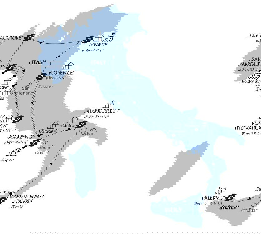 Your grand tour of Italy draws to an end. Departure transfers arrive at Palermo Falcone–Borsellino Airport. (B)