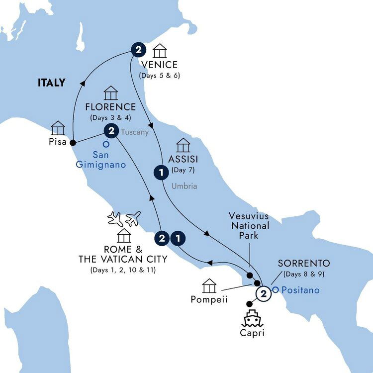 Continue your 11 days in Italy with a journey to the peaceful town of Assisi, nestled on the slopes of Mount Subasio and renowned for its medieval churches, vibrant frescoes and sun-dappled courtyards. In the valley, see the Church of St. Mary of the Angels, revered as the place of St. Francis' passing.