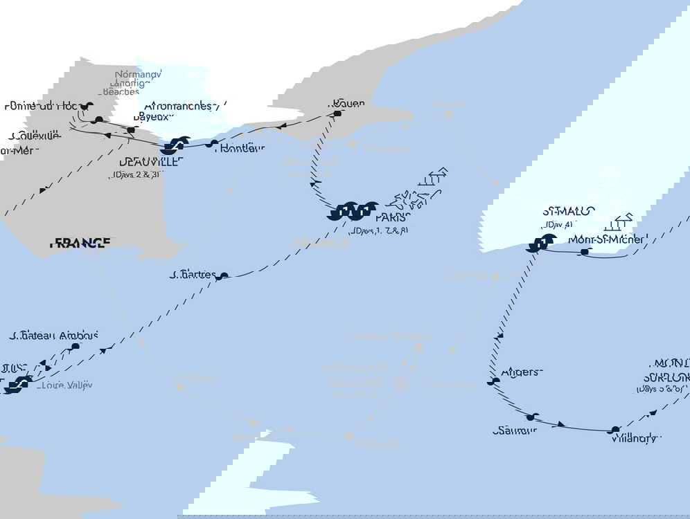 After checking in, the capital's grand boulevards and world-famous landmarks are yours to explore. Meet your Travel Director and fellow guests at the hotel before enjoying a dinner at a local restaurant with cuisine inspired by fresh home-made recipes. (D) Stay: Le Meridien Paris Arc de Triomphe
