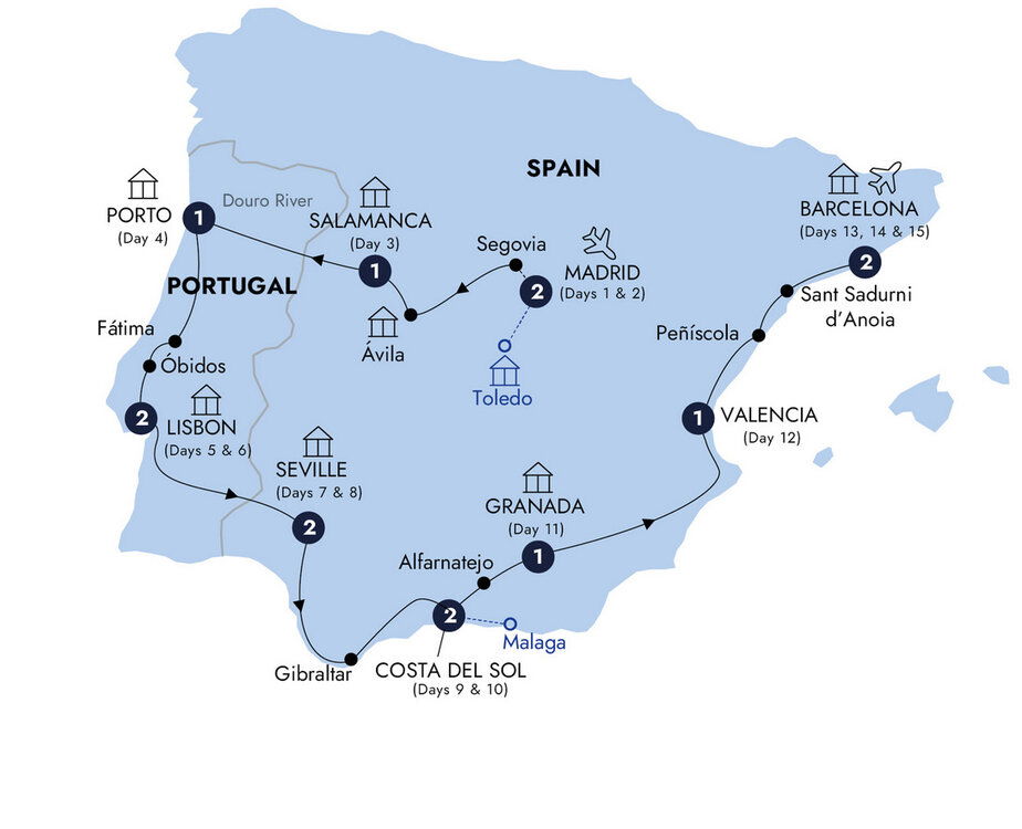 Continue through the Eixample district to visit Gaudi's extraordinary masterpiece, the Sagrada Família*. See the central nave with its giant, tree-like pillars, spectacular vaulting and the beautiful rainbows flooding in through the intricate stained-glass windows. At a local restaurant, join your fellow travellers for dinner to toast to newfound friends and a two-week in-depth exploration of the Iberian Peninsula.