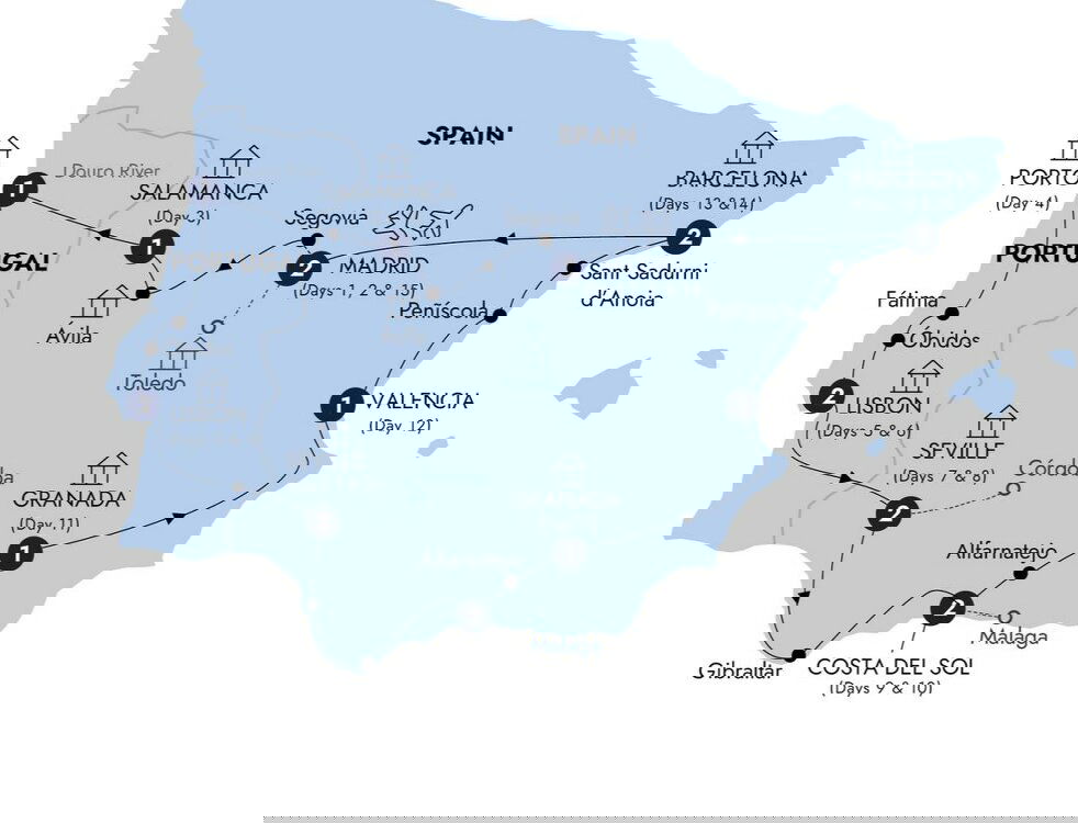 Continue your 15-day Spain and Portugal itinerary with a visit to the fortified city of Segovia. Walk through the medieval streets with a Local Expert and see the magnificent Alcazar fortress, before continuing to the historic aqueduct. Journey west, overlooking the ancient walls of Ávila, en route to Salamanca. During your guided sightseeing tour of Salamanca, admire the golden stone buildings the city is famous for, including the arcaded Plaza Mayor, the honey-coloured cathedral and the 16th century university buildings. (B) Stay: Alameda Palace, Salamanca