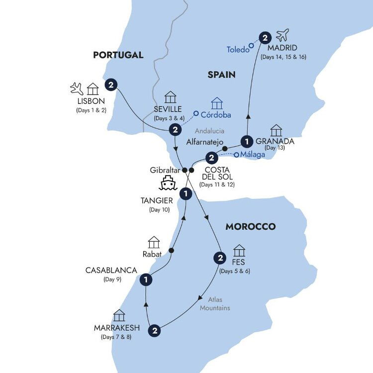 Today, bid a fond farewell to your memorable journey through Spain, Morocco & Portugal as you transfer to the airport and reflect on the experiences and adventures you've had. (B)