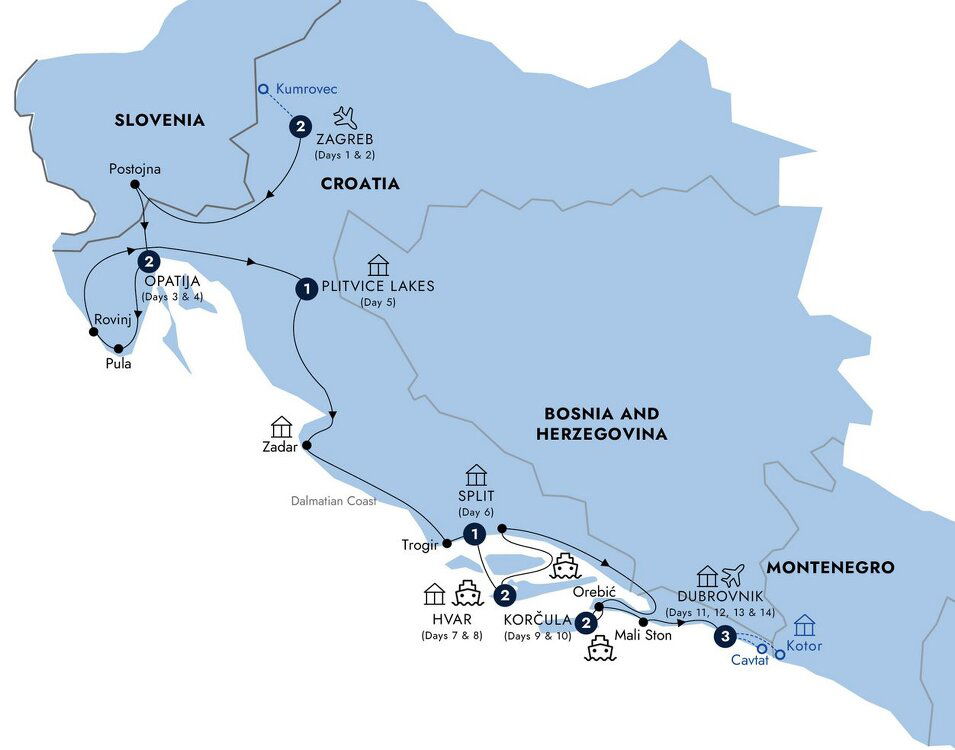 With the rest of the day at your leisure, perhaps enjoy the luxuries of the five-star Hotel Dubrovnik Palace, your home for the next three nights. (B) Stay: Dubrovnik Palace