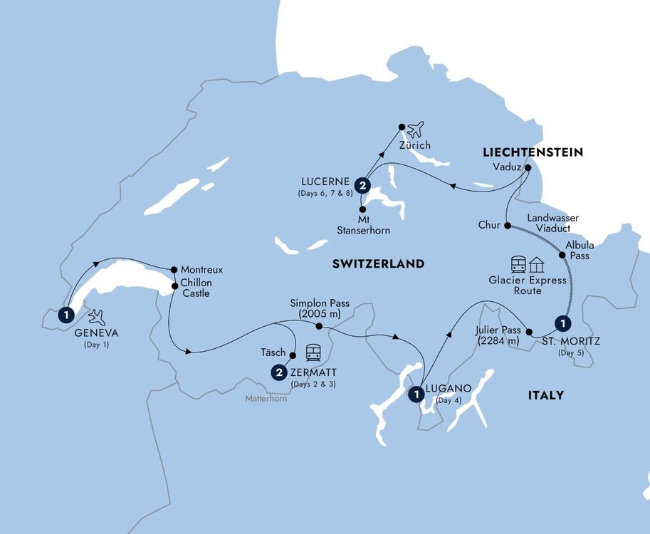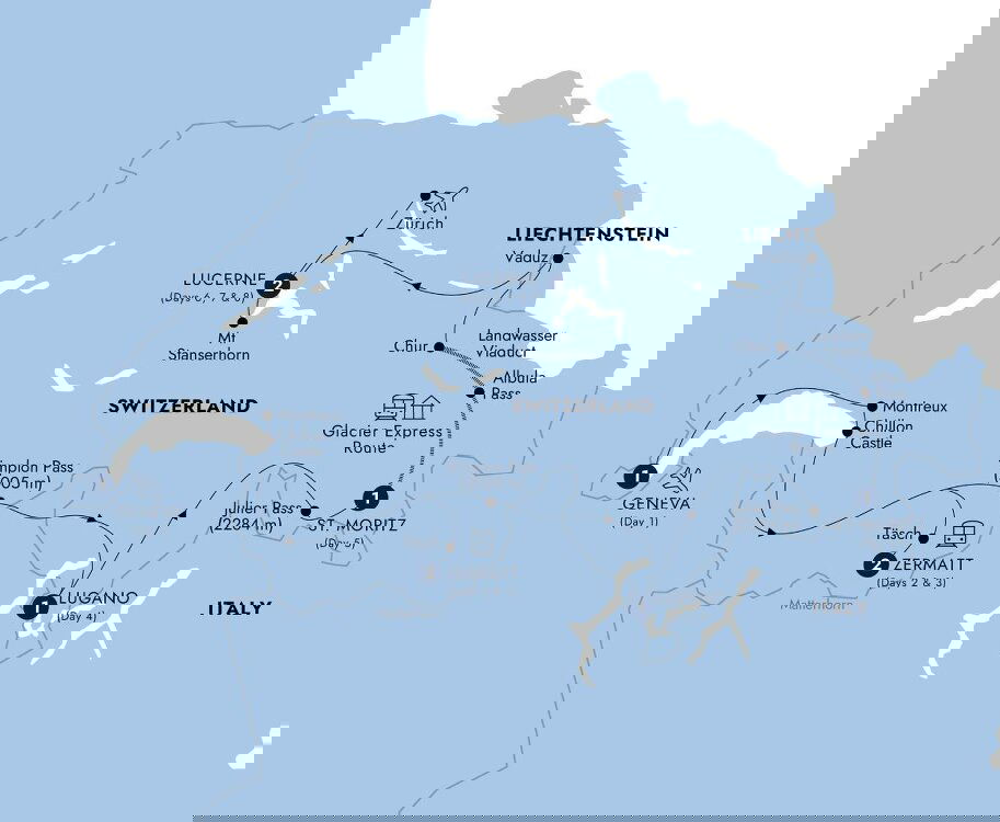Start the day with a scenic train ride along part of the route of the Glacier Express, through unforgettable scenes of ice-capped mountains, stone-built villages and lush meadows. At Chur, reboard your coach and travel along the valley of the Upper Rhine to spend some time in Vaduz, the tiny capital of the Principality of Liechtenstein, where you explore the area around the castle. Continue to Lucerne alongside the dramatic Walensee and Lake Zürich.