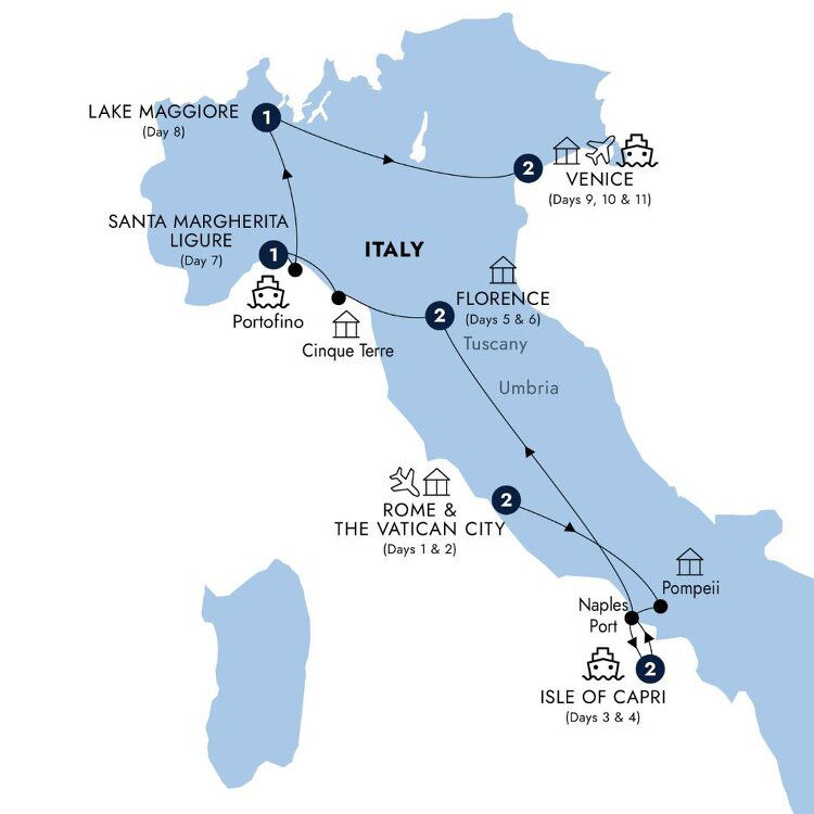 Our journey continues to the elegant seaside village of Portofino, epitome of la dolce vita. Admire the colourful houses, browse the boutiques or stay a while in the cafe bars on the piazzetta, watching the yachts moored in the harbour. (B/D) Stay: Best Western Regina Elena, Santa Margherita Ligure