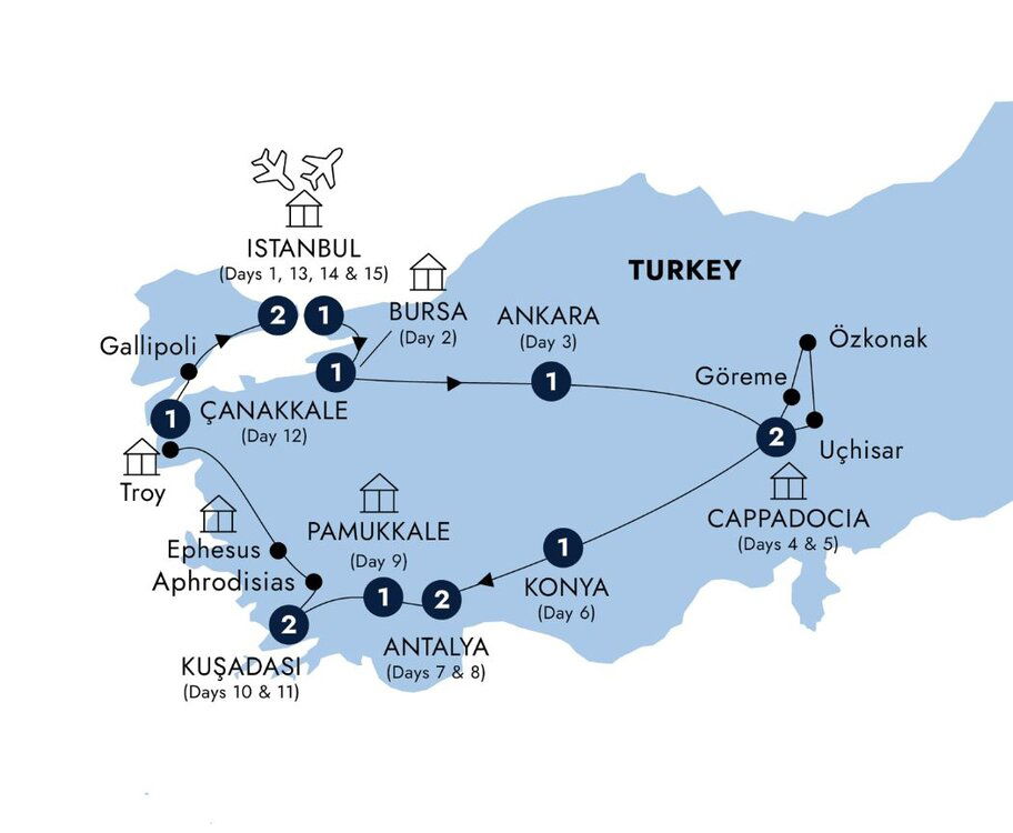 In Homer's city of Troy, the focal point of the Trojan War and the backdrop to one of history's most famous love stories, that of Paris and Helen of Troy, the face that launched 1000 ships. A replica of the mighty Trojan Horse, which helped the Greeks capture the city in 1200 B.C., can be found beside the city's walls. After some time exploring, continue your journey to Çanakkale, a gateway to the Gallipoli WWI battlefields. (B) Stay: Kolin, Çanakkale