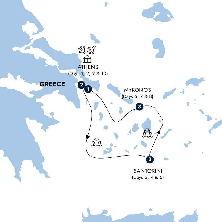 Bid a fond antío to your Greek island holiday. Your journey comes to an end with a transfer to Athens airport. (B)