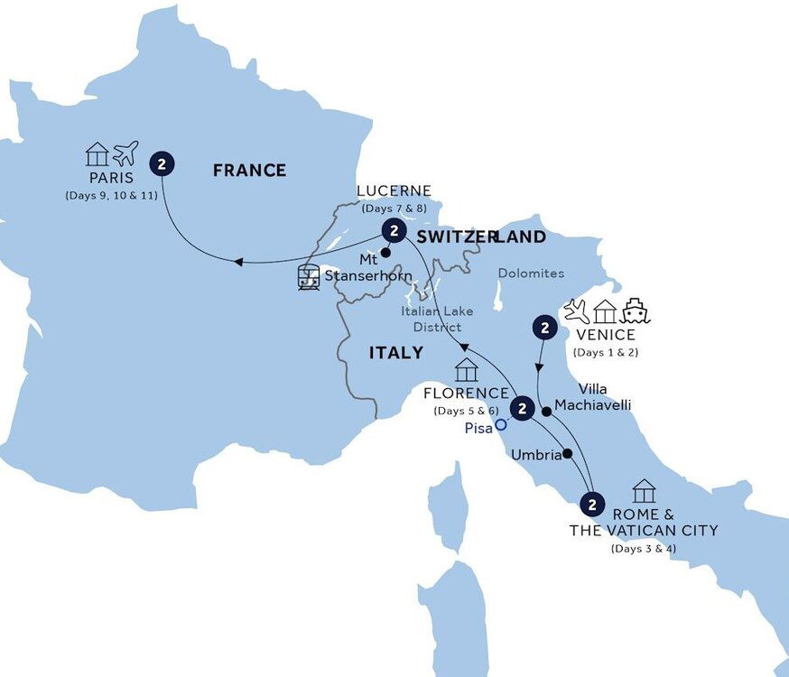 Head north towards the Italian Lake District via Lake Lugano. Continue into the heart of the Swiss Alps, passing through the Saint Gotthard Tunnel, one of the longest road tunnels in the world, before travelling alongside towering mountains and past rushing torrents, down to scenic Lake Lucerne.