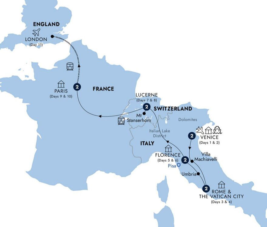 Head north towards the Italian Lake District via Lake Lugano. Continue into the heart of the Swiss Alps, passing through the Saint Gotthard Tunnel, one of the longest road tunnels in the world, before travelling alongside towering mountains and past rushing torrents, down to scenic Lake Lucerne.