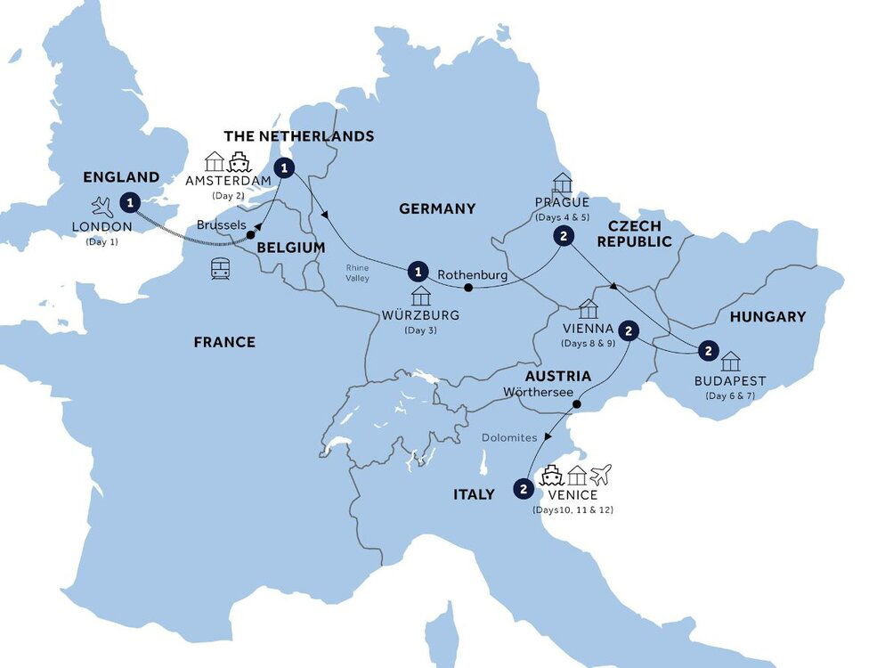 This day's route takes you past quiet villages, through Styria's forested mountains and into the Carinthian Lake District. Continue past Europe's warmest lake, the Wörthersee, to cross into Italy near Tarvisio. Then follow mountain valleys and cascading streams down to the Veneto Plain en route to the unique city of Venice. Arrive by private boat to your hotel. In the late afternoon and early evening, sip a cocktail on the corner of Piazza San Marco, whilst you are serenaded by an ensemble of talented musicians.