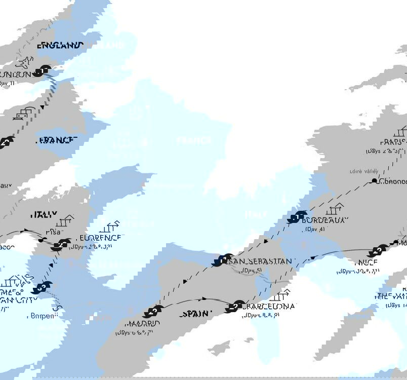Relax and enjoy the grand landscapes of the Chianti hills and Umbria, before passing the Apennine Mountains to arrive at the Eternal City, filled with classic antiquities, medieval buildings, Renaissance palaces and Baroque churches.