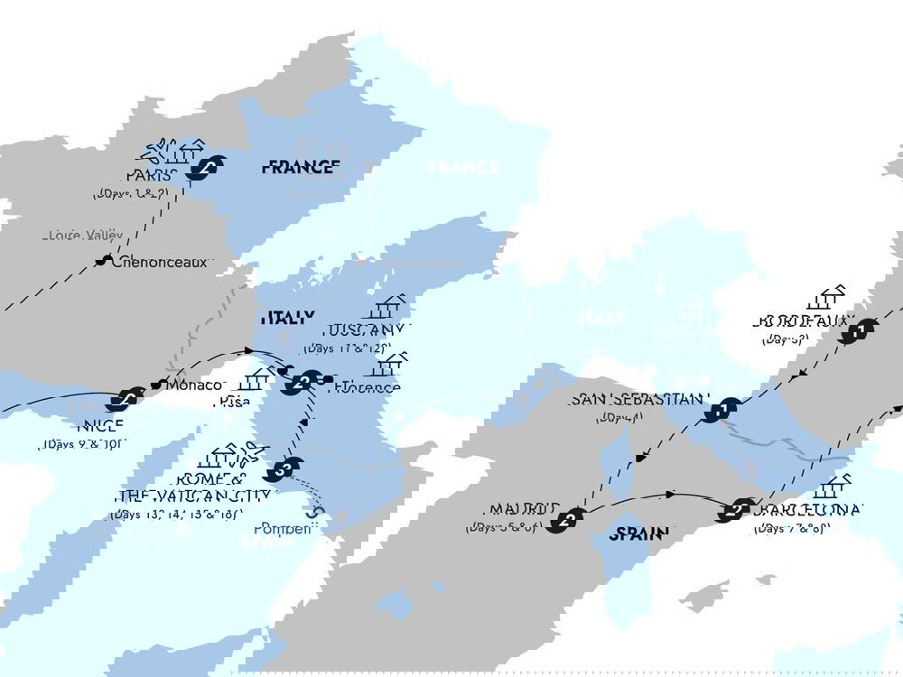 Relax and enjoy the grand landscapes of the Chianti hills and Umbria, before passing the Apennine Mountains to arrive at the Eternal City, filled with classic antiquities, medieval buildings, Renaissance palaces and Baroque churches.