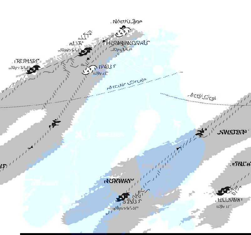 Today you'll be heading further north through the winter Lapland landscape. Cross the Finnish–Norwegian border as you make your way to Honningsvåg, the northernmost and smallest city in Norway. Your drive will take you along the mighty Porsangerfjord, the fourth largest fjord in Norway. You will take the subsea Nordkapp Tunnel to the island of Magerøya, to reach your hotel in this small fishing community. Explore the quaint city by taking a stroll along the waterfront before retiring to your hotel and enjoying a delicious dinner. (B/D) Stay: Scandic Nordkapp