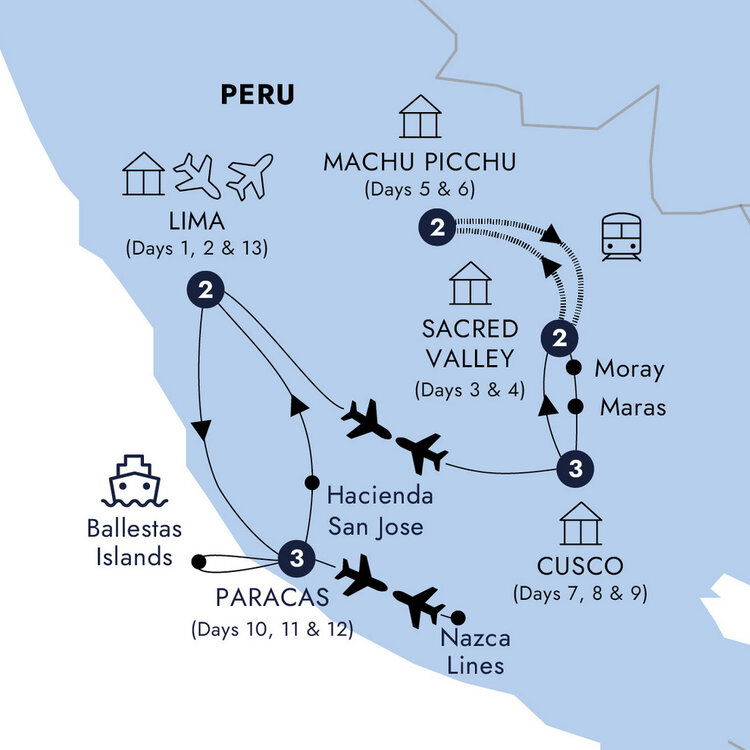 Embark on the next leg of your journey with a flight from Cusco to Lima. Arriving in Peru's capital city, head out on a leisurely coastal drive to the town of Paracas. This beach town where the desert meets the Pacific Ocean is the ideal jumping off point for the Ballestas Islands as well as Paracas National Reserve. Indulge your curiosity learning how this protected desert peninsula is known for its abundant wildlife and as an important archaeological area once home to a prehistoric civilization from 800 BCE and 200 BCE. (B/L) Stay: Paracas, a Luxury Collection Resort