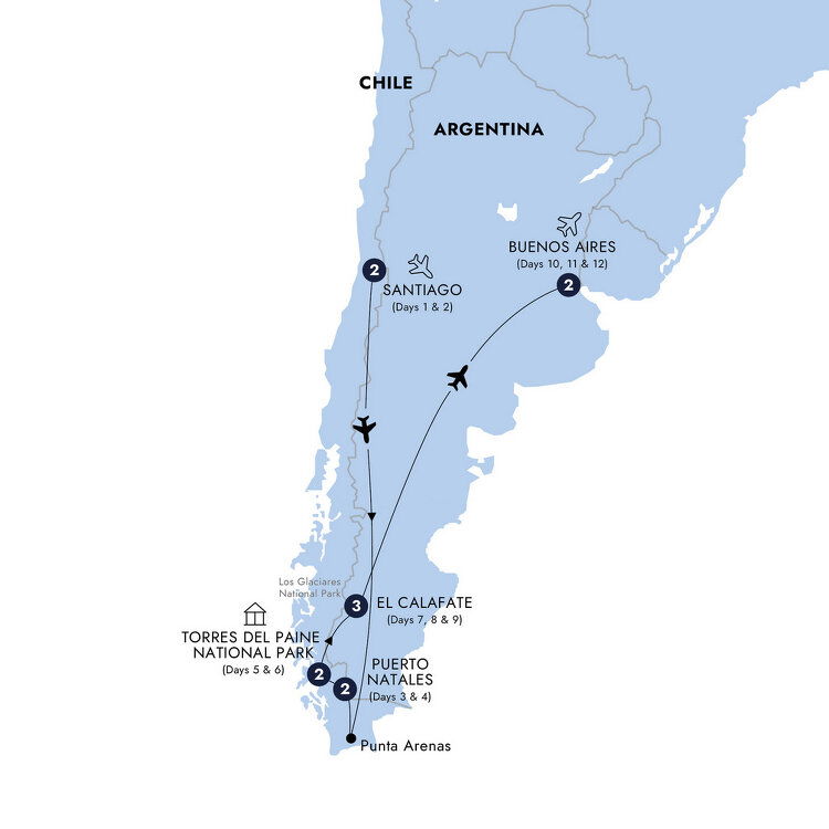 Fly south to Punta Arenas, a historic port once vital to Antarctic exploration. From here, journey across the windswept Patagonian steppe to Puerto Natales, a quiet frontier town on the fjord-like Seno Última Esperanza. With its glacier-fed waters and distant granite peaks, this remote outpost offers your first glimpse of Patagonia's awe-inspiring scale and solitude. (B) Stay: Remota Patagonia Lodge, Puerto Natales