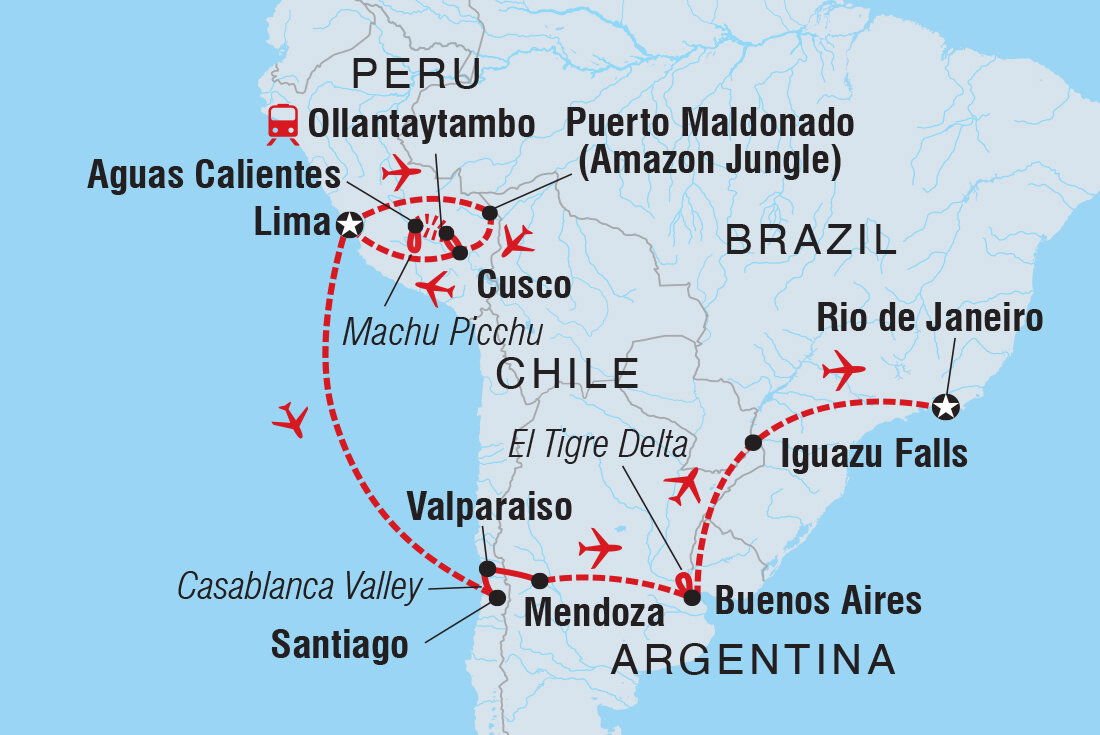 Today, you'll take your next unaccompanied flight form Lima to Santiago. When you arrive, you'll be met at the airport and taken to your accommodation where you'll have another welcome meeting at 6 pm. If you arrive early, maybe head out and explore the Parque Forestal just steps from your front door.