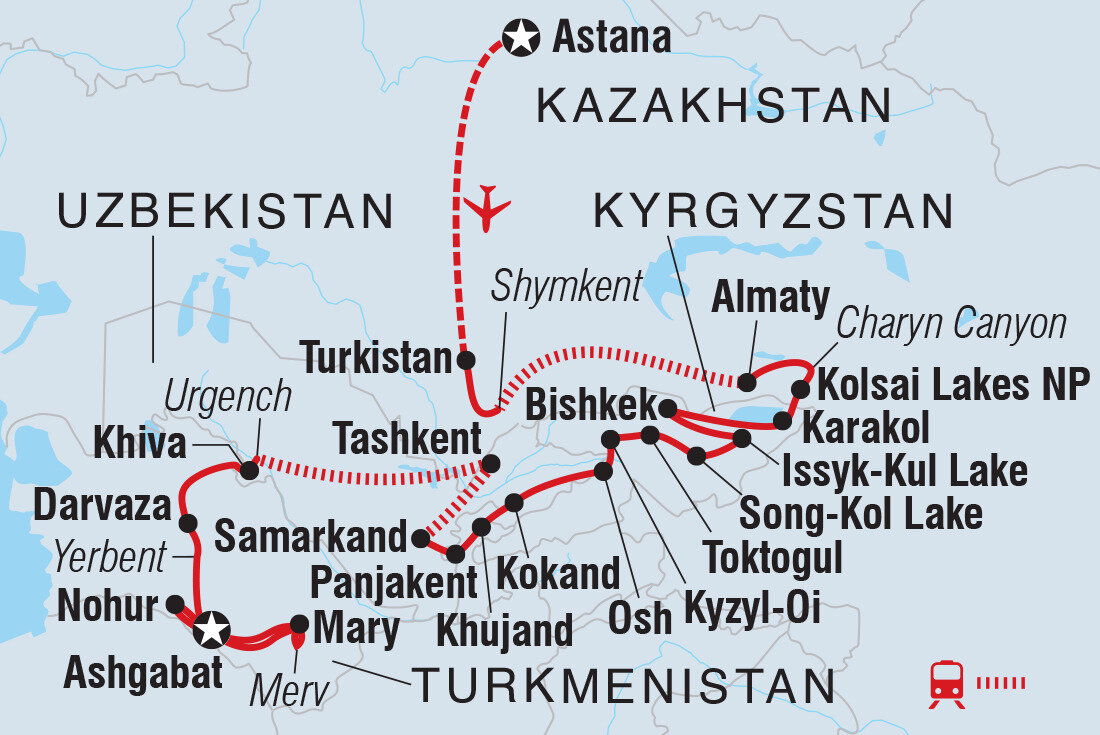 Head out on a city tour this morning, starting with a visit to Khoja Ahmed Yasawi Mausoleum – Kazakhstan’s most iconic building. Built by Tamerlane, it’s said that three visits here are equal to one visit to Mecca. As it’s a religious site, it’s recommended that women wear a headscarf when entering. On the grounds, you'll find a rose garden, monuments, an archaeological museum and a mosque. Leaving the mausoleum, jump in your private transport to Shymkent, stopping at the ancient settlement of Otrar on the way. First excavated in 1969, its history dates back to the first century AD, with remnants of palaces, mosques and bathhouses that can still be seen today. This is also where Genghis Khan's army is said to have fought when the Mongols first invaded Central Asia. Board your overnight train in the evening. (B)