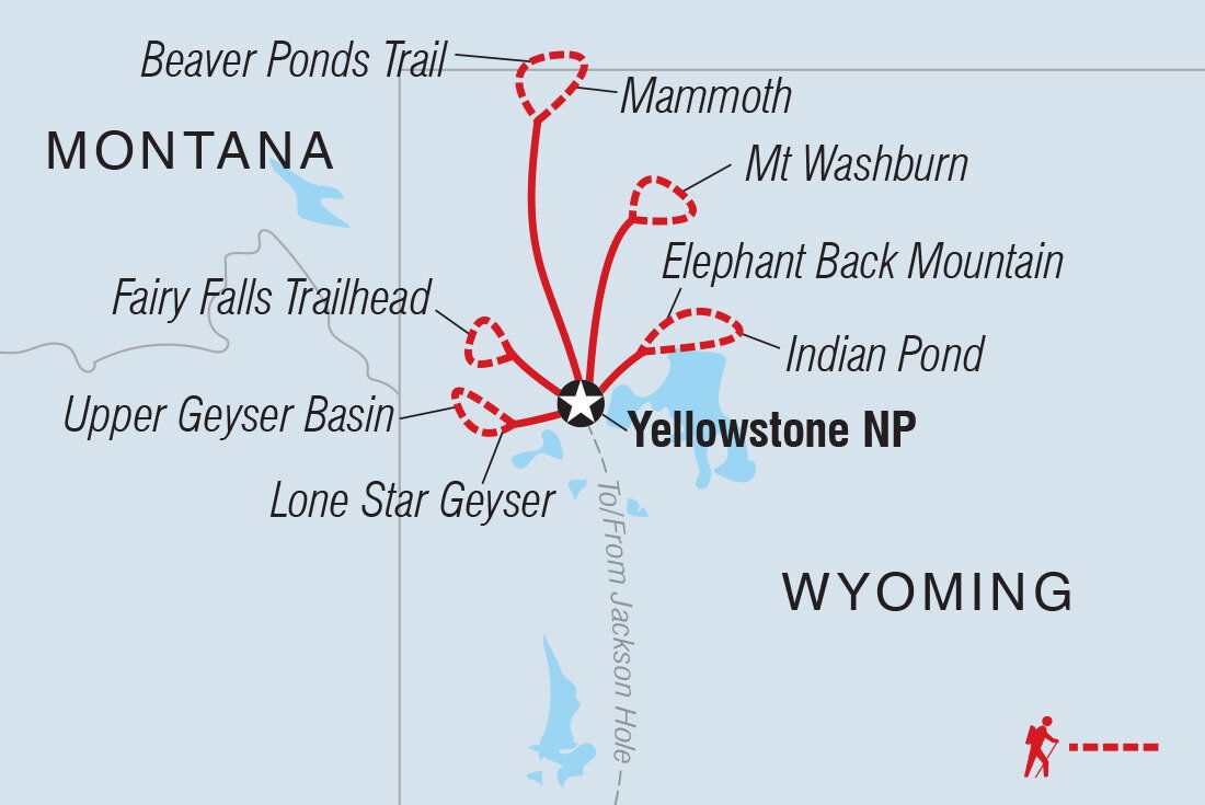 Our final day’s hike takes us through classic Yellowstone meadows and lodgepole pine forests to Fairy Falls, a 200-foot waterfall plunging off a pine-studded cliff.