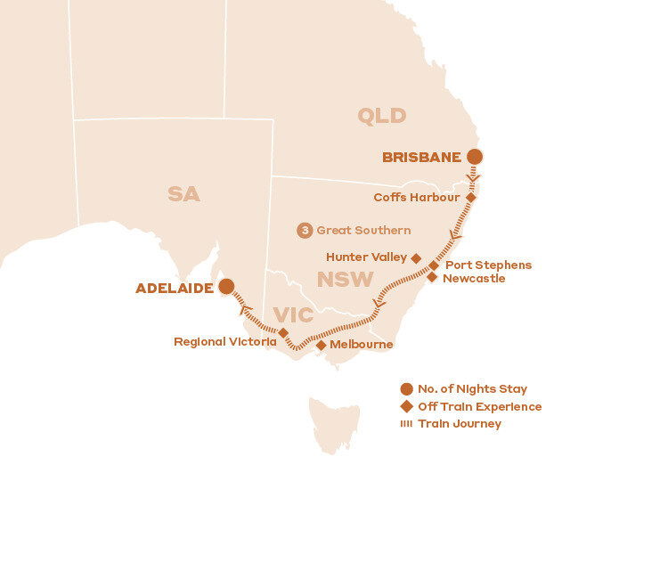 Your East Coast journey begins with a warm welcome at Hanworth House in East Brisbane, where you'll check in gather with fellow travellers for a celebratory start to your summer journey. After setting off from Brisbane on the Great Southern, life on board begins to unfold. Savour lunch as the train winds south, then settle into the rhythm of your cabin and the passing landscapes.